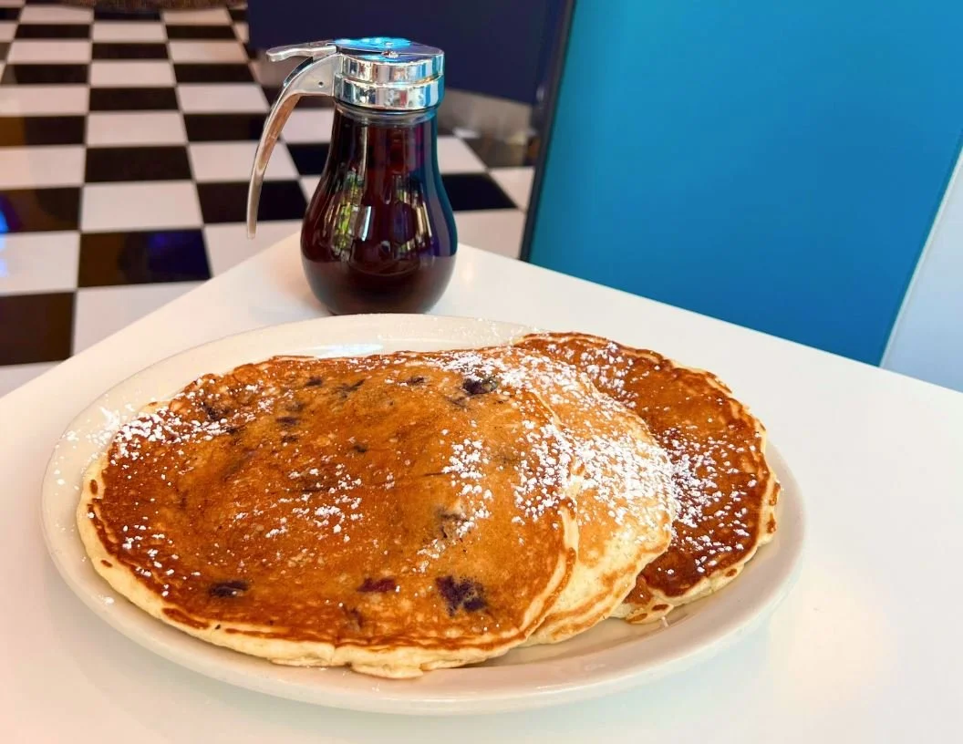 Craving something sweet? Dive into our Blueberry Pancakes, fluffy stacks bursting with juicy blueberries and served with powdered sugar, maple syrup, and butter. It's breakfast bliss, Ed Debevic's style!